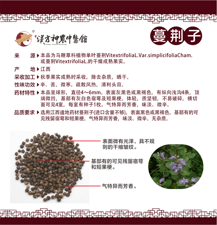 来源:本品为马鞭草科植物单叶蔓荆VitextrifoliaL.Var.simplicifoliaCham.或蔓荆VitextrifoliaL.的干燥成熟果实。