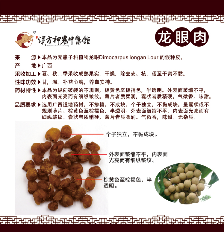 品名:龙眼肉(Lónɡ Yǎn Ròu)《中国药典》 别名:龙眼、桂圆、圆眼子 来源:本品为无患子科植物龙眼Dimocarpus longan Lour.的假种皮。 产地:广西 采收加工:夏、秋二季采收成熟果实,干燥,除去壳、核,晒至干爽不黏。 性味功效:甘,温。补益心脾,养血安神。 药材特性:本品为纵向破裂的不规则,棕黄色至棕褐色,半透明。外表面皱缩不平,内表面光亮而有细纵皱纹。薄片者质柔润,囊状者质稍硬。气微香,味甜。 品质要求:选用广西道地药材,不掺糖。不成块,个子独立,不黏成块。呈囊状或不规则薄片。棕黄色至棕褐色,半透明。外表面皱缩不平,内表面光亮而有细纵皱纹。囊状者质稍硬,薄片者质柔润。气微香,味甜。无杂质。