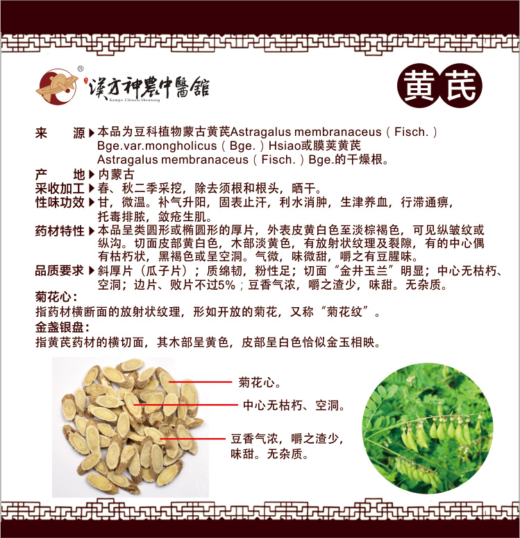 菊花心:指药材横断面的放射状纹理,形如开放的菊花,又称“菊花纹”。金盏银盘:指黄芪药材的横切面,其木部呈黄色,皮部呈白色恰似金玉相映。