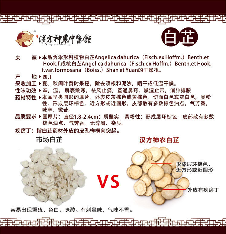 来源:本品为伞形科植物白芷Angelica dahurica(Fisch.ex Hoffm.)Benth.et Hook.f.或杭白芷Angelica dahurica(Fisch.ex Hoffm.)Benth.et Hook.f.var.formosana(Boiss.)Shan et Yuan的干燥根。